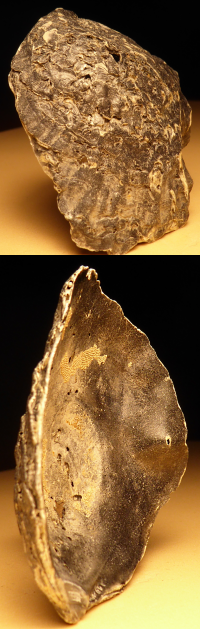 Die Auster ist eine Muschel und damit ein Tier. Zum Schutz gegen Feinde hat sie eine Schale aus zwei sehr massiven Klappen. Die Klappen sind innen mit sehr glattem Perlmutt überwachsen. Typische Maße für eine der zwei Klappen: Masse etwa 15 Gramm, Länge und Breite bei etwa 6 cm. Siehe auch unter