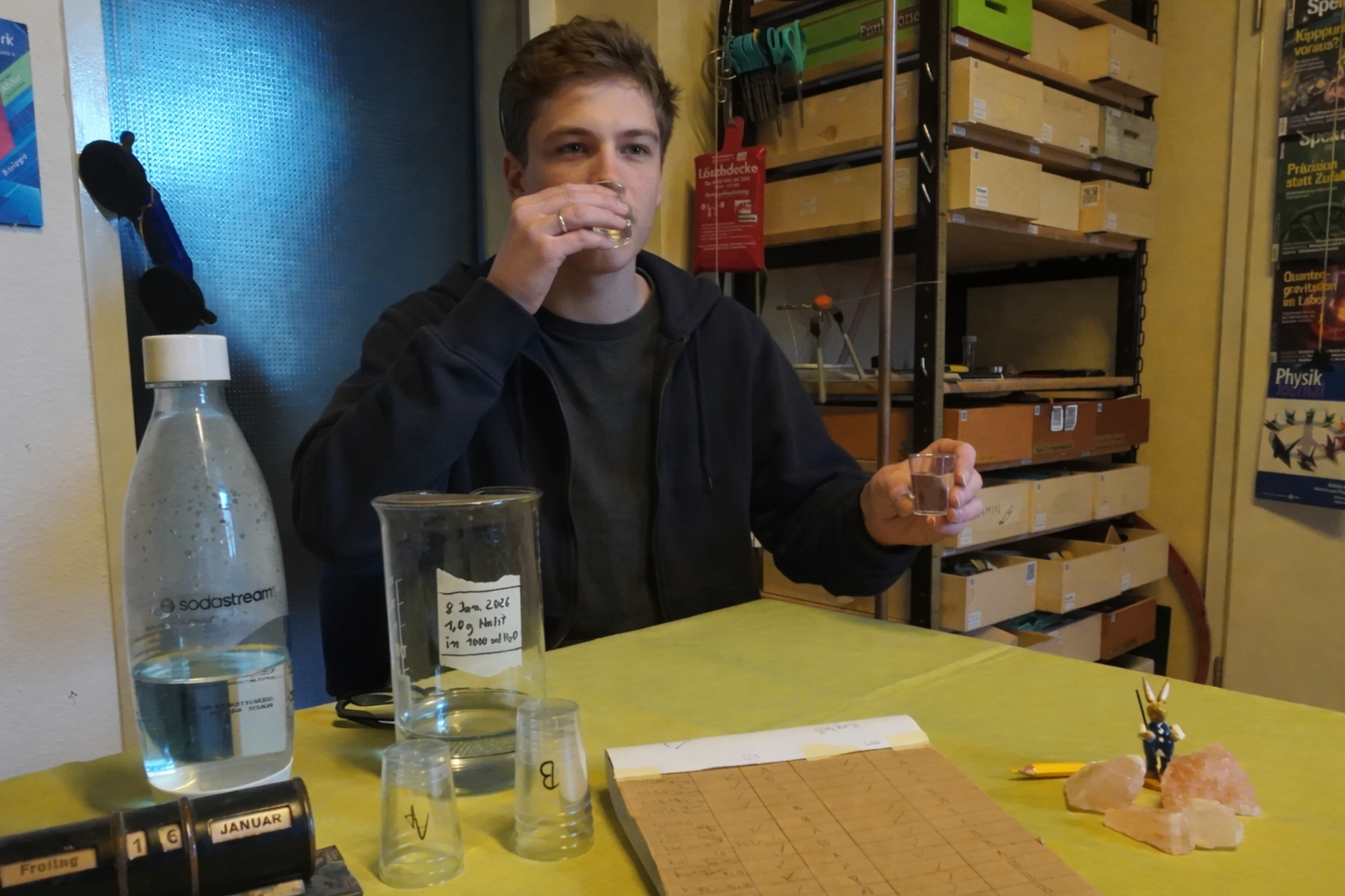 Ab welchem Salzgehalt können Menschen über eine Geschmacksprobe Salzwasser von Süßwasser unterscheiden? Eine Studie aus Marokko aus dem Jahr 2020 kommt zu dem Ergebnis, dass die meisten Erwachsenen (84 %), Salzwasser ab einer Konzentration von etwa 0,9 Gramm Salz pro Liter erkennen können. Wir stellten den Versuch mit 1,0 Gramm Halit (fast reines NaCl) auf einen Liter und mit 25 Probanden nach. Alle konnten bei einer Blindverkostung eindeutig das leicht salzige Wasser vom reinen Leitungswasser unterscheiden. Da man Salz also bei schon sehr geringen Konzentration gut schmecken könne, empfahlen die Autoren, den Salzgehalt von Nahrungsmitteln (food items) zu senken.